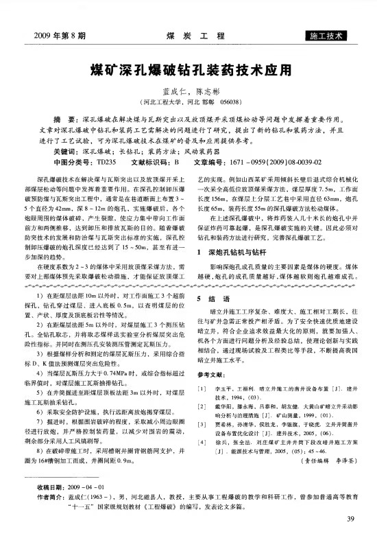 煤礦深孔爆破鉆孔裝藥技術應用