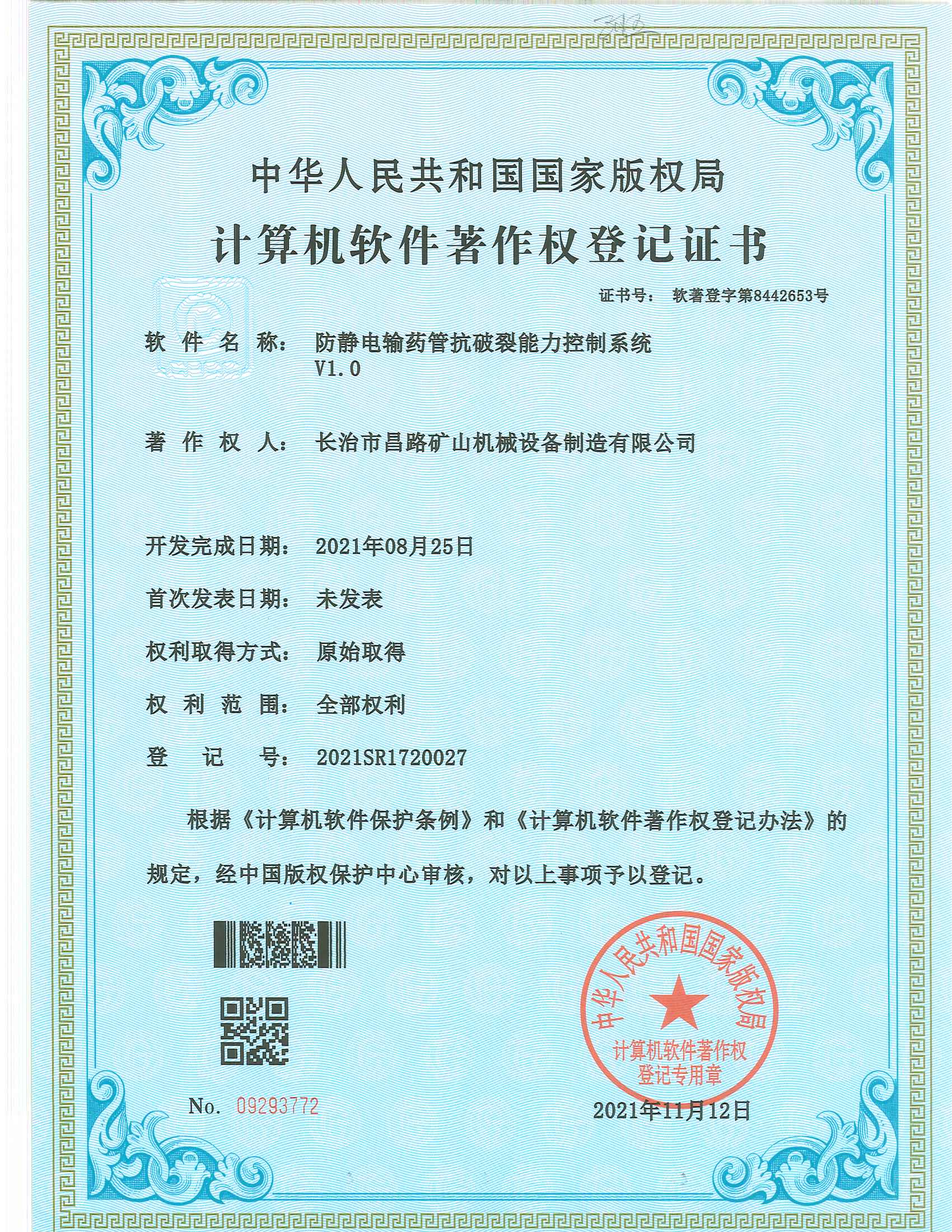 防靜電輸藥管搞破裂能力控制系統(tǒng)著作權(quán)登記證書(shū)